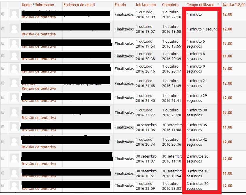O tempo para responder todo o questionário era 50 minutos e os melhores alunos de cada sala conseguiram terminar o questionário em aproximadamente 20 minutos. No entanto, descobri que alguns “gênios” conseguiram responder o questionário em pouco mais de um minuto e tiraram nota máxima.